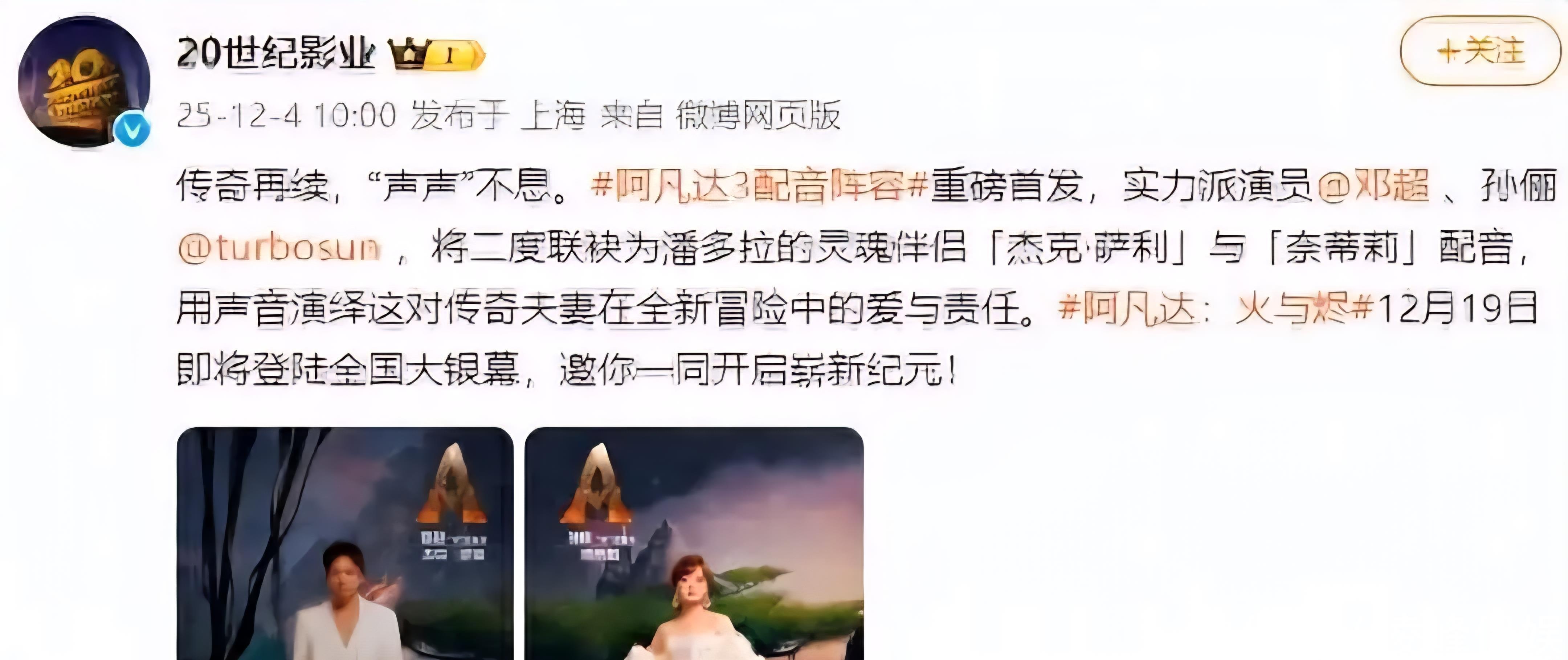 12月4日,电影界传来一则令影迷兴奋的消息:20世纪影业正式公布《阿凡达3》的中文配音阵容,邓超、孙俪夫妇将再度携手,分别为杰克·萨利与奈蒂莉配音。消息一出,“邓超孙俪 阿凡达3配音”的词条瞬间冲上热搜,阅读量五分钟内突破一亿,网友直呼:“最强夫妻档来了!”