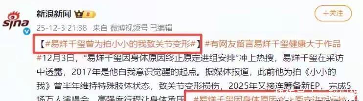 回望易烊千玺的成名路,“拼命”二字贯穿始终。12岁出道,24岁捧回金鸡奖,他靠的不是运气,是“把每件事做到极致”的狠劲。拍《少年的你》时,为演好脑瘫患者,他每天绑着沙袋训练8小时,半年维持异常体态导致脊柱损伤、关节变形;为贴合角色,主动剃寸头晒黑,连导演都感叹“他不是在演,是真的活成了陈念的守护者”。拍《长津湖》时右脚韧带断裂,零下二十度的寒冬里咬牙完成动作戏,连吴京都公开称赞“没想到他这么能扛”。这种“戏比天大”的敬业,让他快速从偶像蜕变为实力派,却也让身体在高压下悄悄透支。