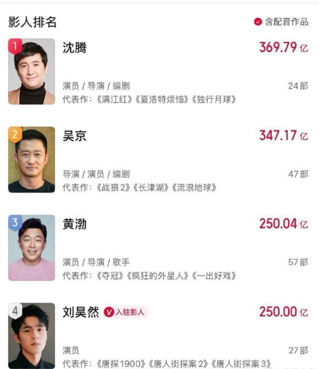从男演员累积票房上看,排在前三名的是:沈腾、吴京、黄渤,而排在第四名的就是刘昊然,目前,他的累积票房已经突破250亿+,看到这样的票房,我们只能说,刘昊然真的太厉害了。