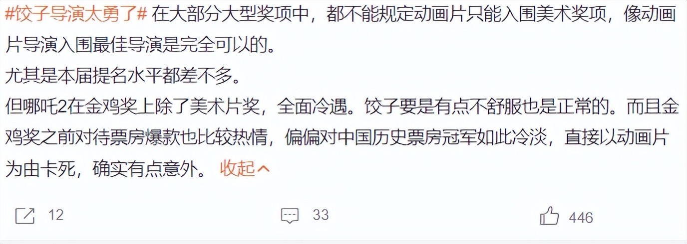 金鸡奖颁奖典礼结束之后,“饺子导演太勇了”话题登上热搜,《哪吒之魔童闹海》获得最佳美术奖,而剧组全员缺席金鹰奖,这样的情况是非常少见的,就算导演没有时间,其他工作人员是可以帮忙带领的,结果一个人都没有来。