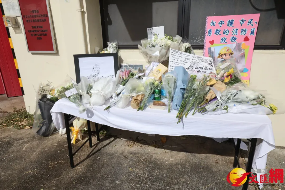 据香港文汇报道,11月29日8时,何伟豪生前驻守的沙田消防局下半旗志哀并举行默哀仪式。消防局外设有铺上白布的桌子,让市民摆放鲜花及心意卡悼念。有心意卡写着“愿一路好走,辛苦你了”、“向守护市民、勇敢的消防员致敬”字句。