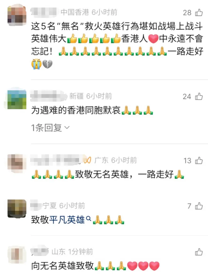 12月1日,香港建造业总工会透露,在本次火灾现场中有5名“无名英雄”牺牲或失联,他们中有本次工程的管工亦有普通工人,其中一名75岁女工本可逃离火场,但她依然选择了返回现场救火。
