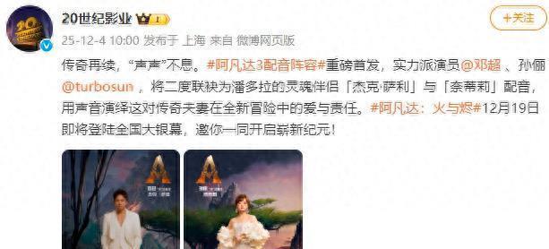 版权归原作者所有,如有侵权请及时联系 12月4日,20世纪影业官方微博官宣《阿凡达3》配音: 传奇再续,“声声”不息。《阿凡达3》配音阵容重磅首发,实力派演员邓超、孙俪,将二度联袂为潘多拉的灵魂伴侣“杰克·萨利”与“奈蒂莉”配音,用声音演绎这对传奇夫妻在全新冒险中的爱与责任。《阿凡达:火与烬》12月19日即将登陆全国大银幕,邀你一同开启崭新纪元!