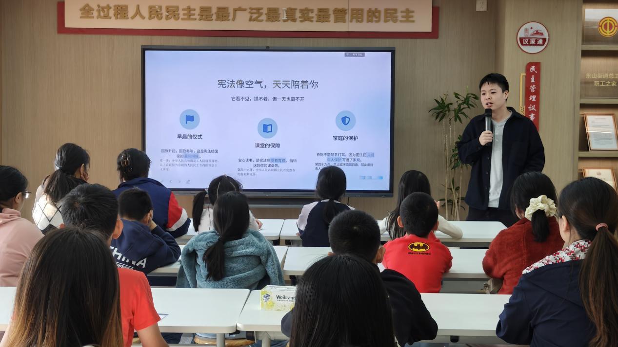 随后,普法讲座在基层立法联系点展开。广东金融学院法学院学生以“环保小卫士:法律与行动守护地球”为题,结合生动PPT和动画,讲解环境保护相关法律,引导同学们树立生态文明法治观念。南方福瑞德律师事务所律师则围绕“宪法与我们息息相关”的主题,通过贴近生活的案例,阐释宪法与每个人成长、学习的紧密联系,让抽象的法条可知可感、入脑入心。