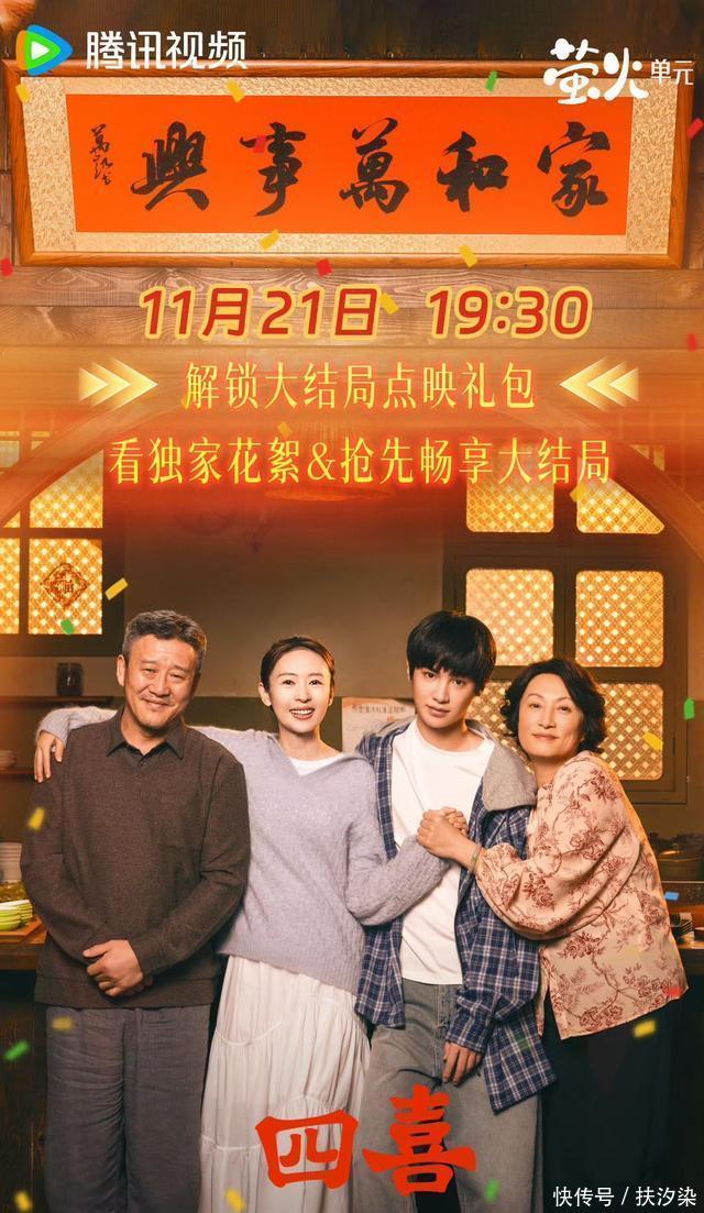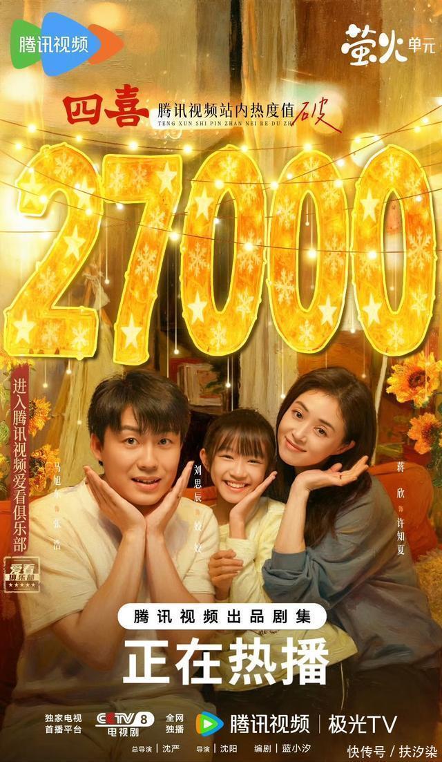 四、腾讯视频、CCTV-8《四喜》 童瑶、蒋欣、黄明昊领衔主演36集都市家庭生活剧。 收视爆了!《四喜》在央视37分钟,收视率就突破3%,剧情狗血是真狗血,全员人设超接地气!每个角色都在鸡飞狗跳中透着小人物的韧劲儿,看得人一会儿哭一会笑,绝对是下饭好剧! 该剧在腾讯站内热度最高达27457,创下萤火单元剧集热度历史纪录,酷云收视率峰值突破3.6122%,累计播放量4.25亿,实现台网双丰收。