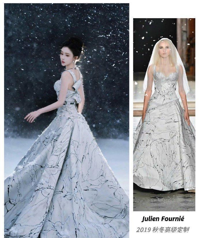 爱奇艺尖叫之夜的孟子义,可以说打出了一张“王炸牌”。她身穿的是法国顶级高定品牌Julien Fournié 2019秋冬系列的闭秀婚纱。这条裙子可不简单,通体银白色,裙身上蔓延着精致的冰裂纹理刺绣,在灯光下仿佛冰晶闪烁。搭配冰蓝色系冷艳妆容和钻石头饰,整个人散发出一种“凡人勿近”的仙气与冷冽。