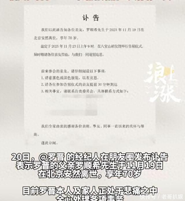讣告发布当天,妻子却在上海晒日常 11月20日,罗晋的经纪人在社交平台上发布了一则讣告,正式对外公布罗晋父亲去世的消息。