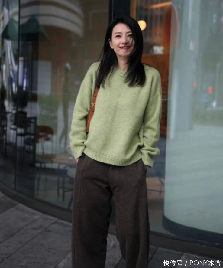 比如果绿色!下面这件果绿色针织套头衫,搭配一条棕色直筒裤,再背一款棕色单肩包,微风拂面,笑起来格外具有亲和力!