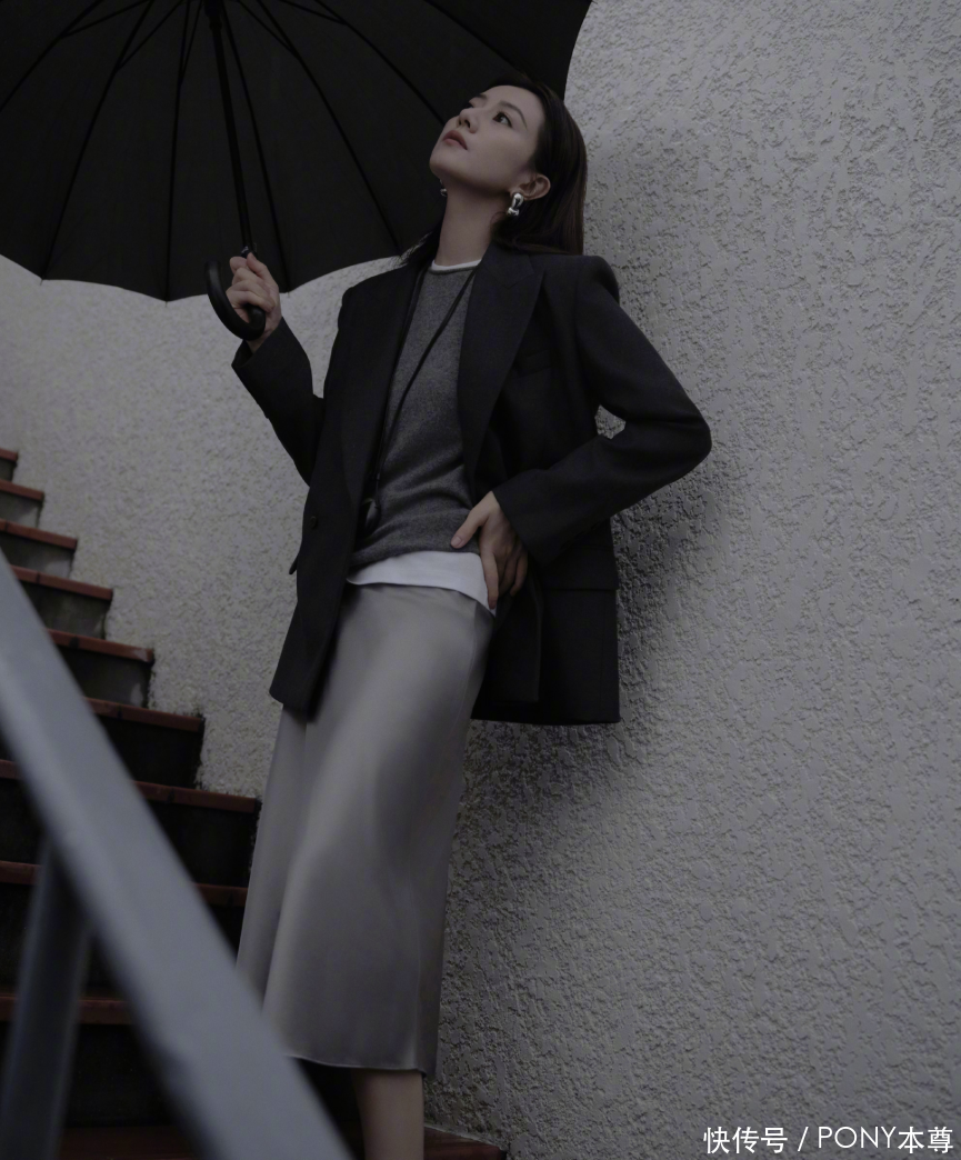 如果说穿白色优雅大方,那么黑色则让她看起来充满知性气质!比如上面的黑色西装外套,搭配灰色针织衫,叠搭白色T恤,看起来理性又充满高知感!搭配银灰色缎面半身裙,让女人味也展现了出来!